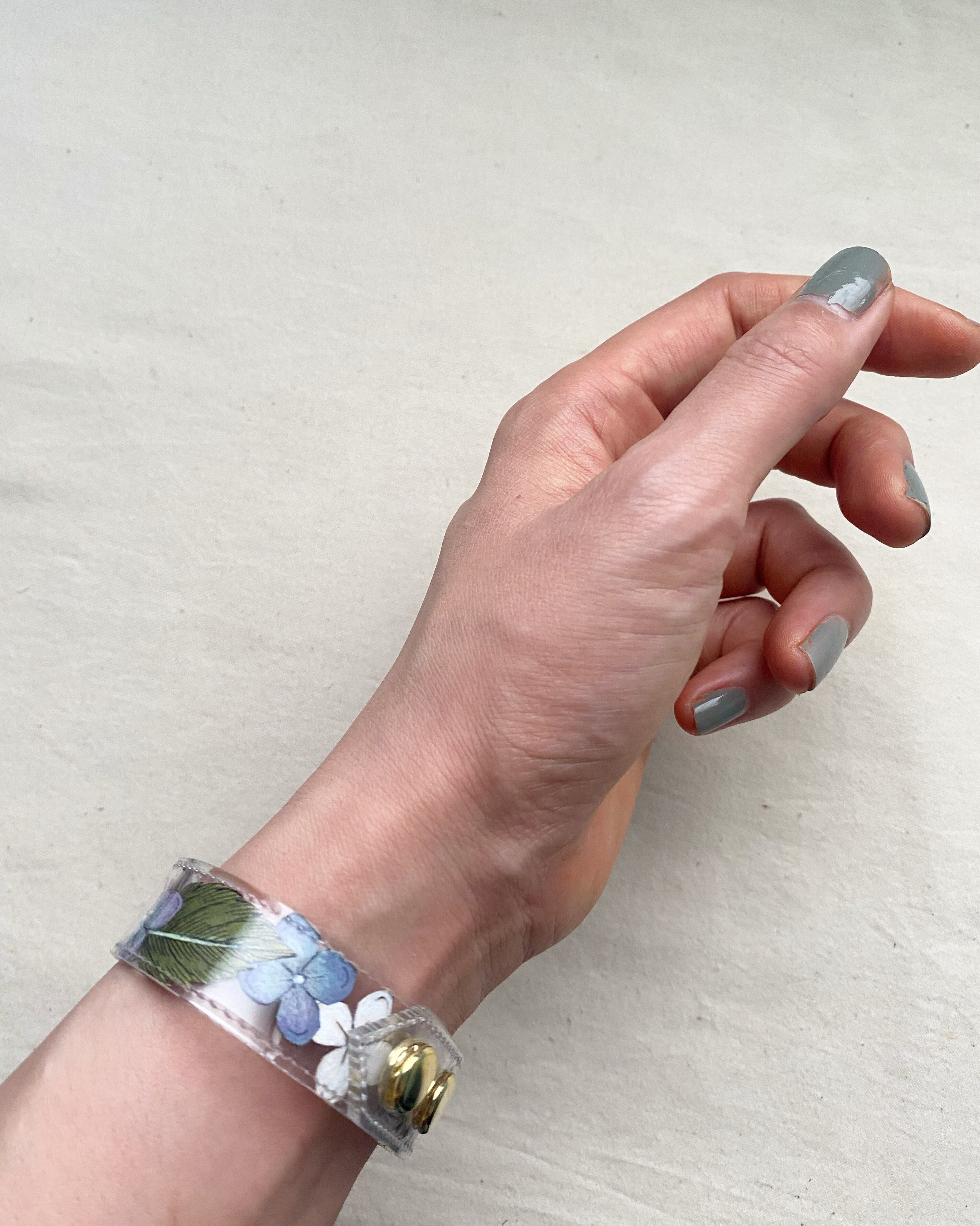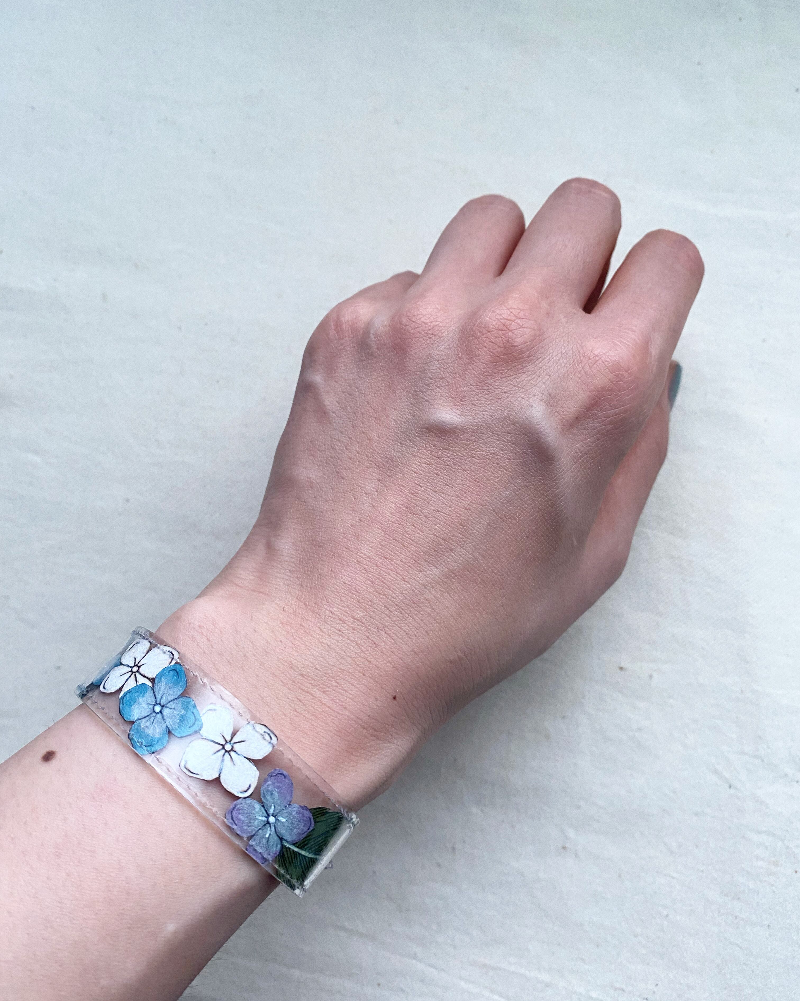 その紫陽花をクリア素材で挟んで縫いあげた細身のクリアブレスです。